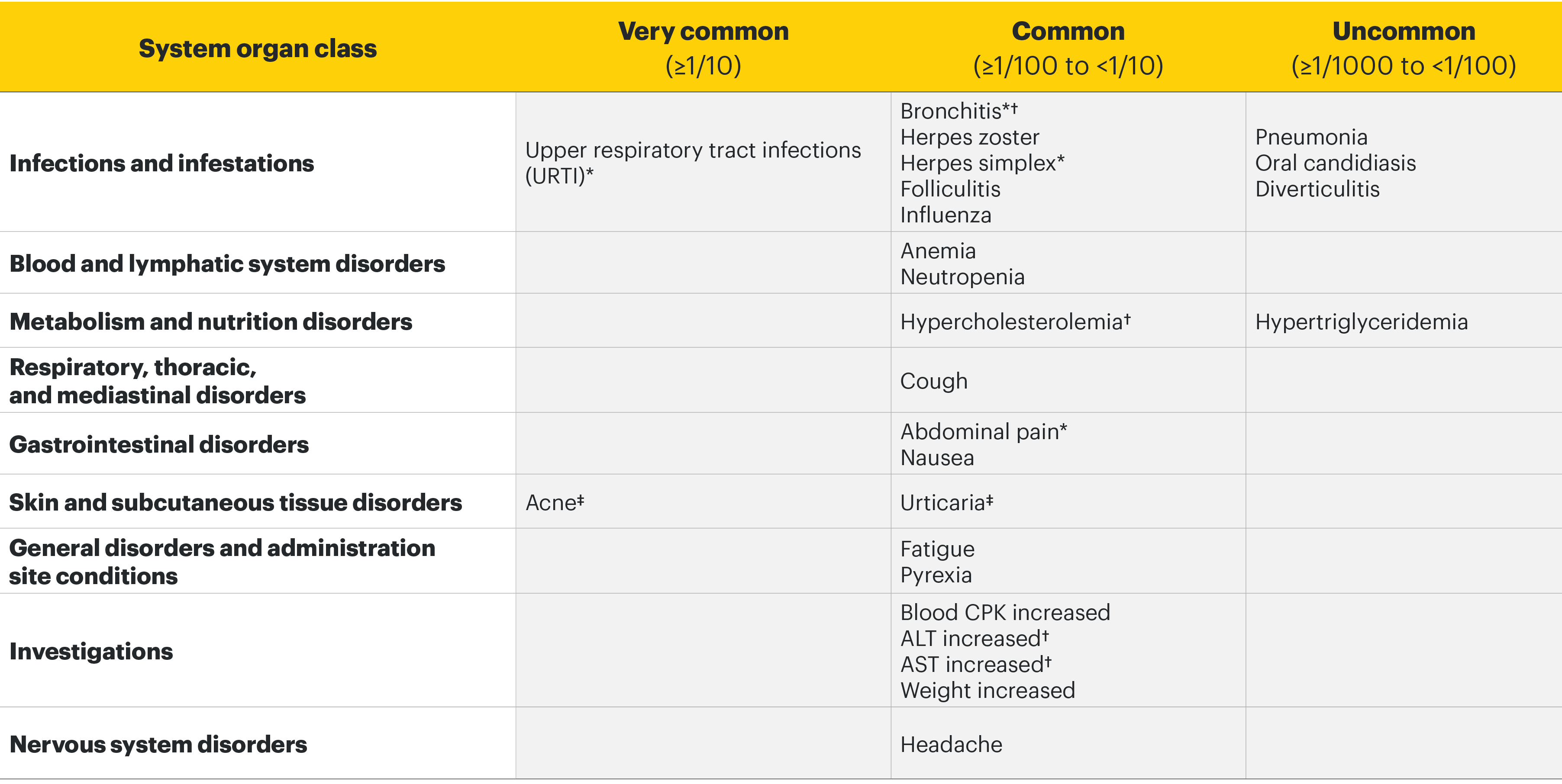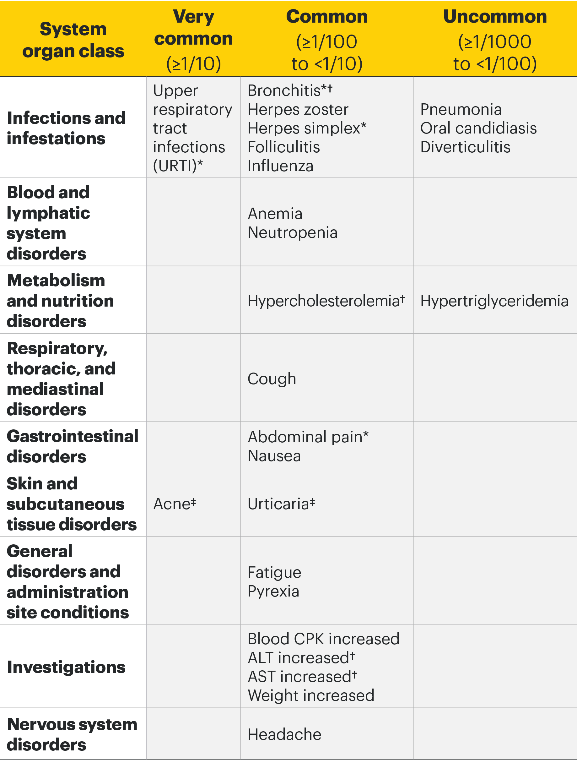 ‡In rheumatologic disease trials, the frequency was common for acne and uncommon for urticaria.
