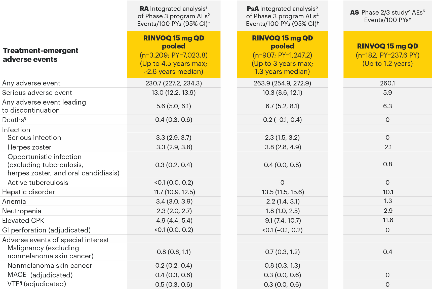 TEAEs observed with RINVOQ 15 mg in 3 separate safety data sets in RA, PsA, and AS