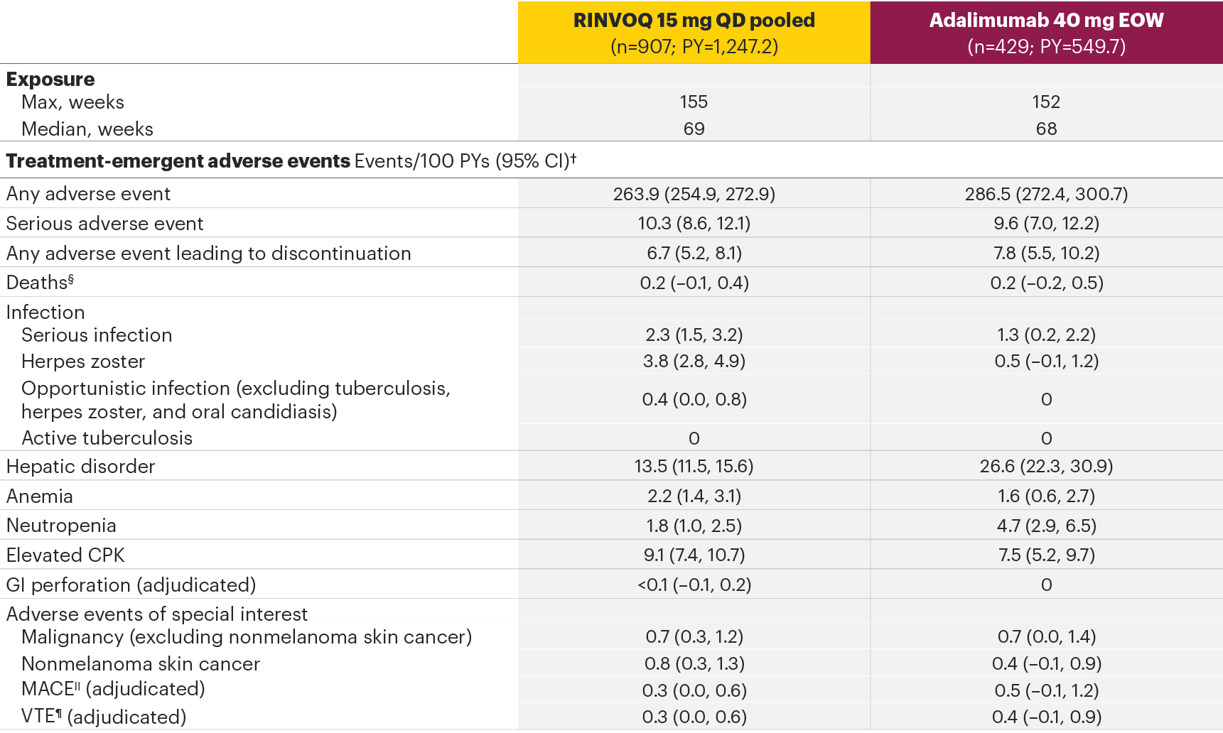 - RINVOQ 15 mg QD (N=3209) (6 trials): SELECT-EARLY (MTX-naive), SELECT-NEXT (csDMARD-IR), SELECT-MONOTHERAPY (MTX-IR), SELECT-COMPARE (MTX-IR), SELECT-BEYOND (bDMARD-IR), SELECT-CHOICE (bDMARD-IR)