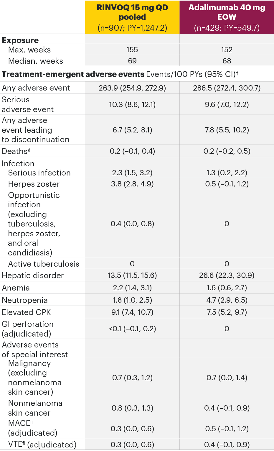 *In RA studies, patients who switched from placebo, adalimumab, MTX, or abatacept to RINVOQ were included in the RINVOQ analysis set from the start of RINVOQ, while those who switched from RINVOQ to adalimumab were included in the adalimumab analysis set from the start of adalimumab and were censored at the time of switch. MTX monotherapy was censored at time of rescue to combination therapy (addition of RINVOQ).