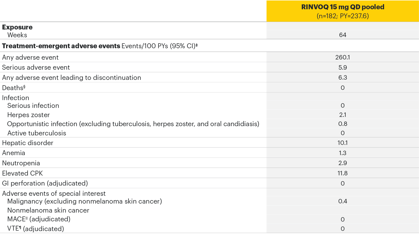 Overall, the safety profile observed in patients with active ankylosing spondylitis treated with RINVOQ 15 mg was consistent with the safety profile observed in patients with rheumatoid arthritis. No new safety findings were identified.