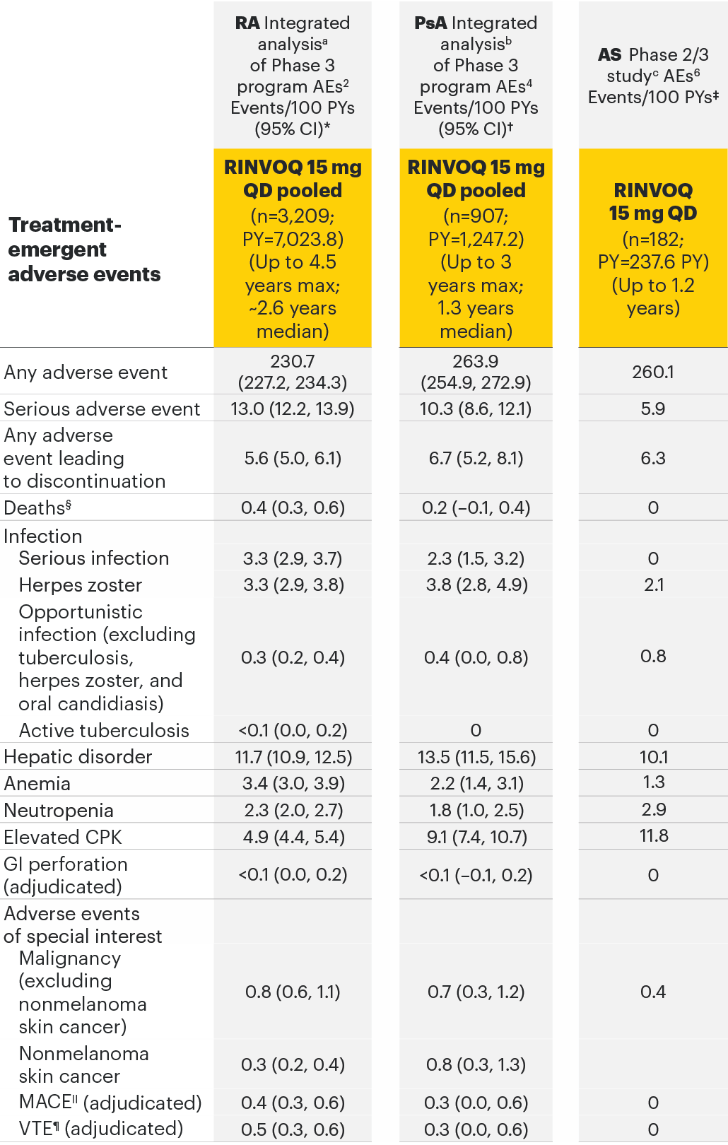 TEAEs observed with RINVOQ 15 mg in 3 separate safety data sets in RA, PsA, and AS