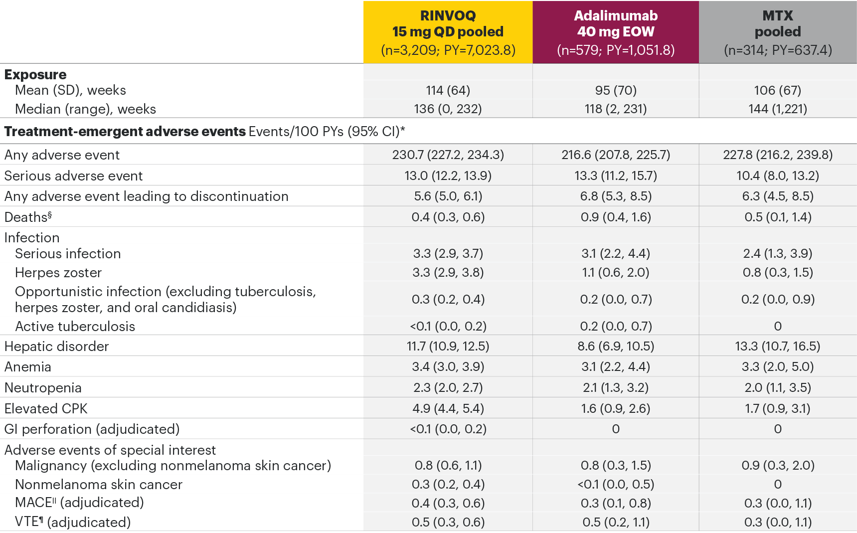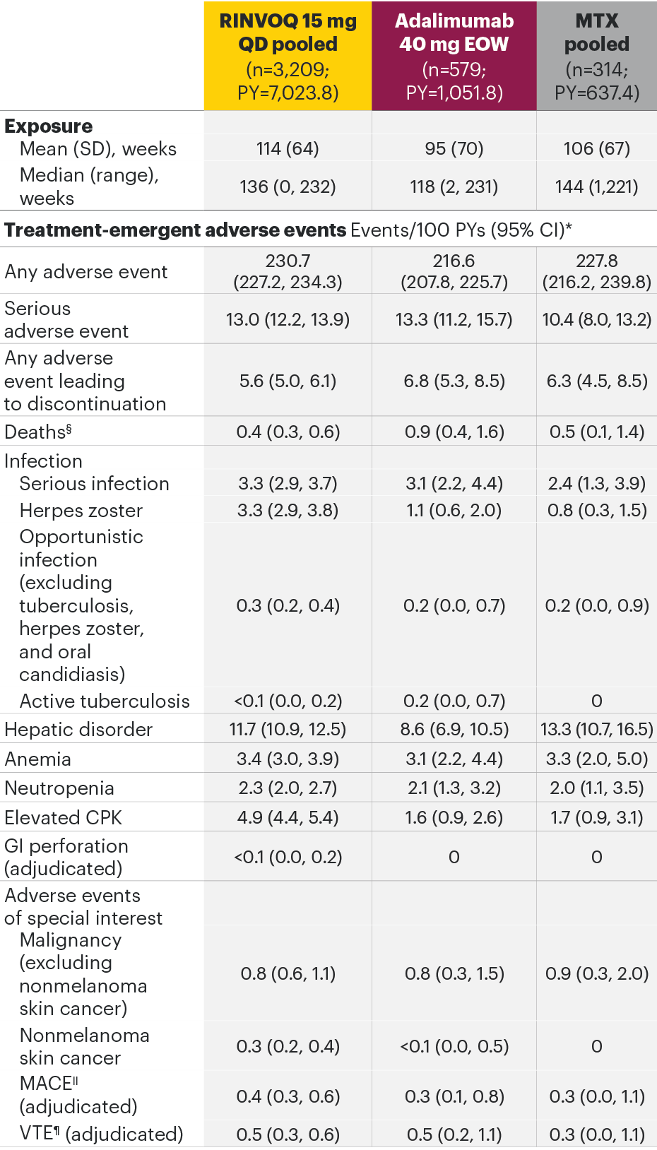 *In RA studies, patients who switched from placebo, adalimumab, MTX, or abatacept to RINVOQ were included in the RINVOQ analysis set from the start of RINVOQ, while those who switched from RINVOQ to adalimumab were included in the adalimumab analysis set from the start of adalimumab and were censored at the time of switch. MTX monotherapy was censored at time of rescue to combination therapy (addition of RINVOQ).