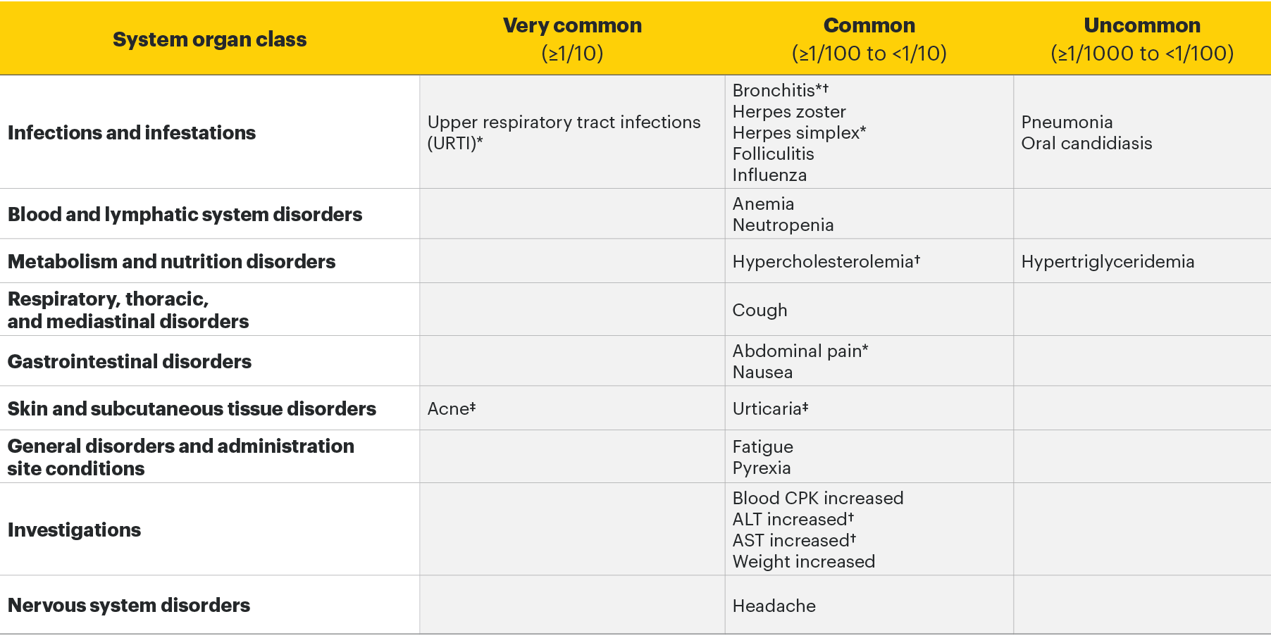 ‡In rheumatologic disease trials, the frequency was common for acne and uncommon for urticaria.