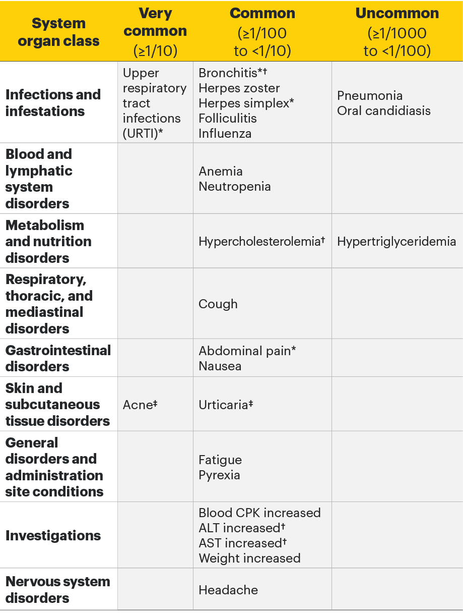 Most common adverse drug reactions:1 The most commonly reported adverse drug reactions were upper respiratory tract infections, blood creatine phosphokinase (CPK) increased, alanine transaminase (ALT) increased, bronchitis, nausea, cough, aspartate transaminase (AST) increased, and hypercholesterolaemia. The most common serious adverse reactions were serious infections.