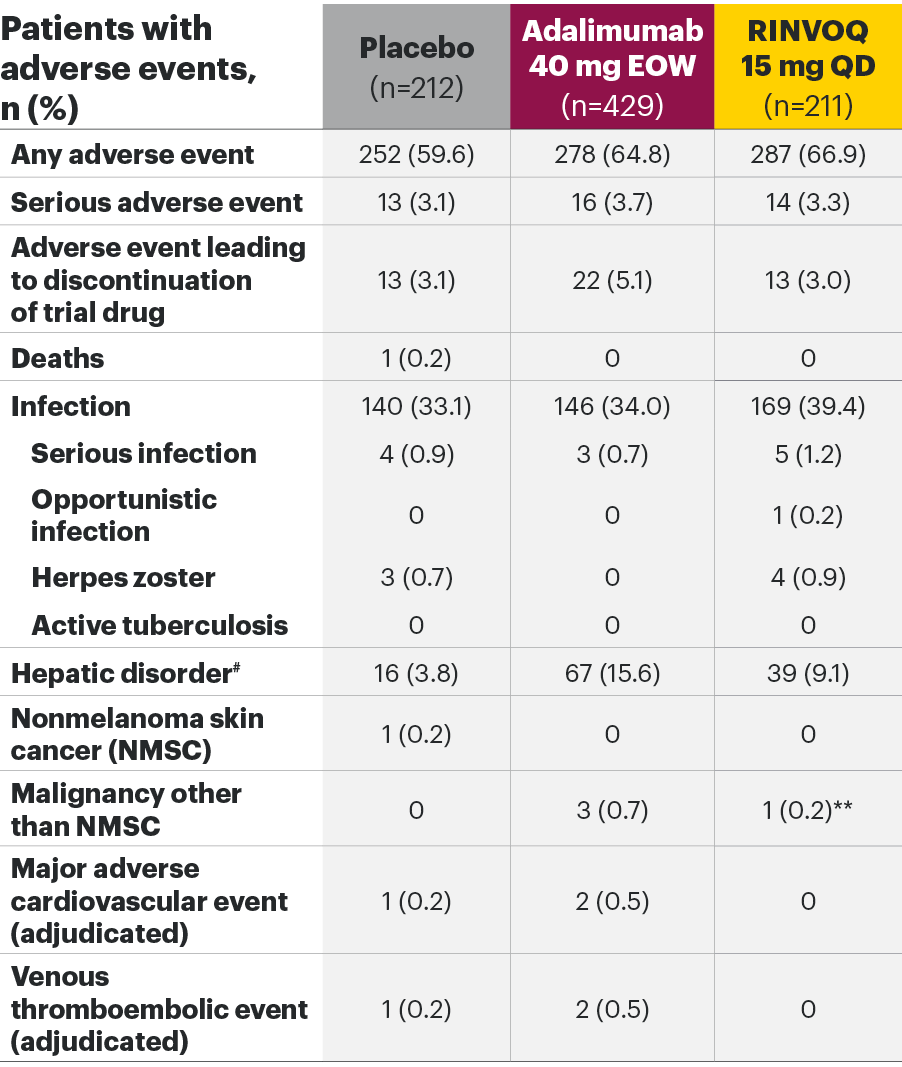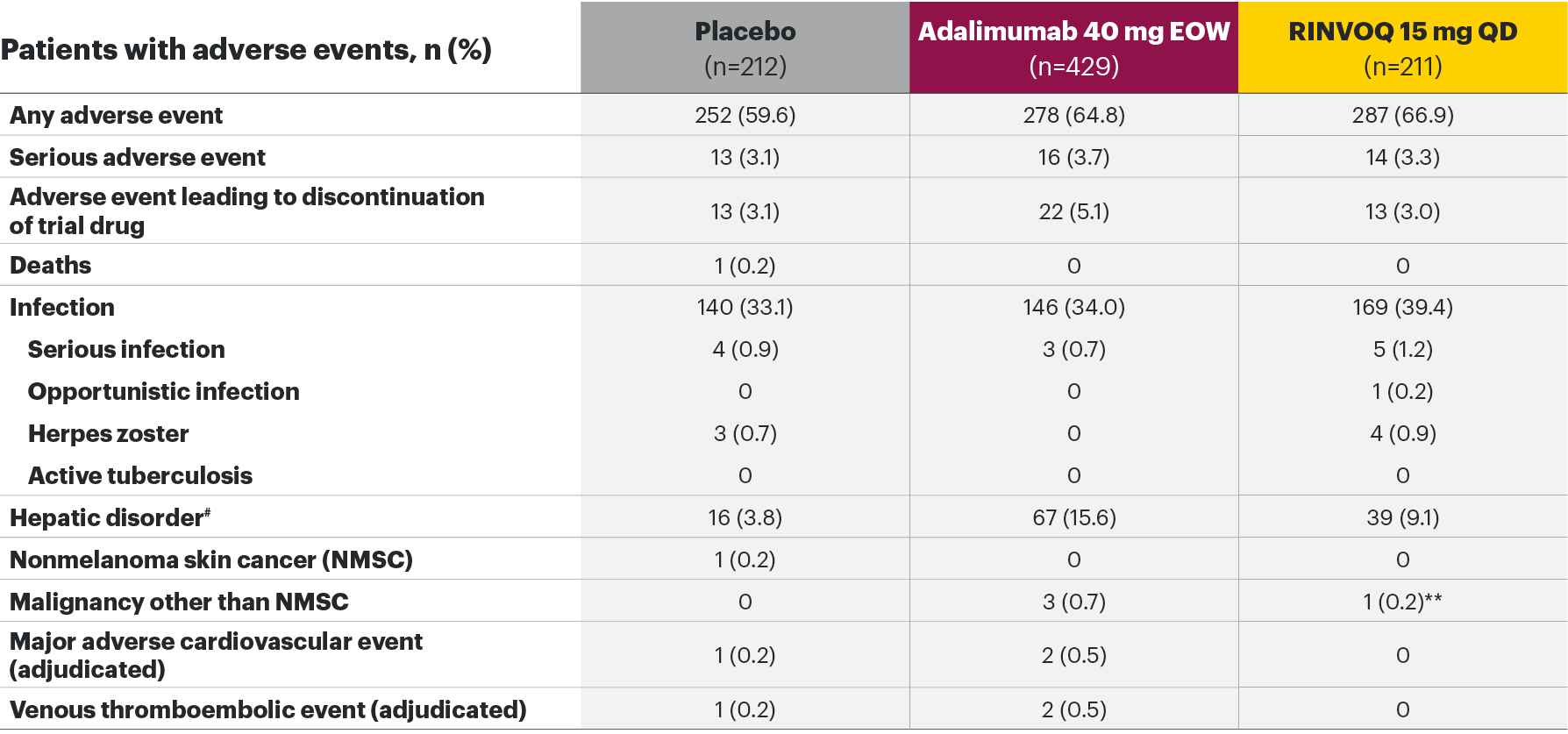 §There were 11 malignancies reported in the RINVOQ 15-mg group (4 basal cell carcinomas, 2 squamous cell carcinomas of skin, and one event each of endometrial adenocarcinoma, lung adenocarcinoma, lung cancer metastatic, malignant melanoma, and neuroendocrine carcinoma) and 6 malignancies reported with adalimumab (2 basal cell carcinomas, and one event each of colon cancer metastatic, ovarian cancer, pancreatic carcinoma metastatic, and uterine cancer).