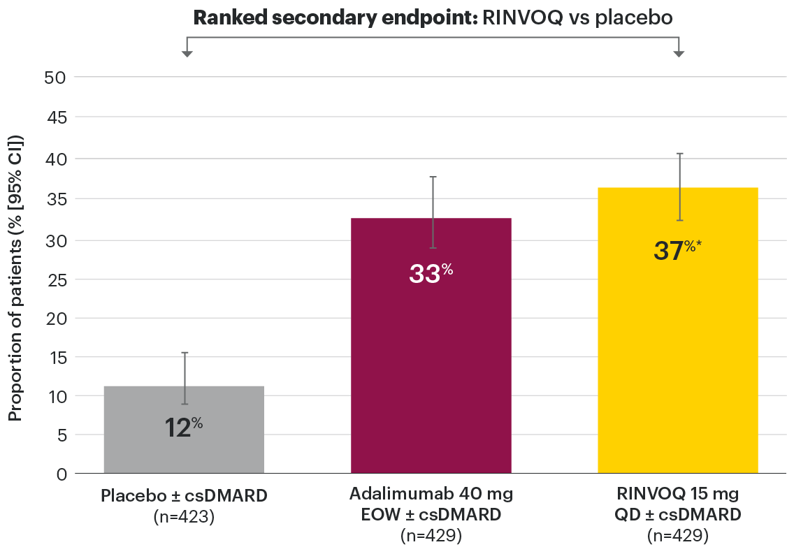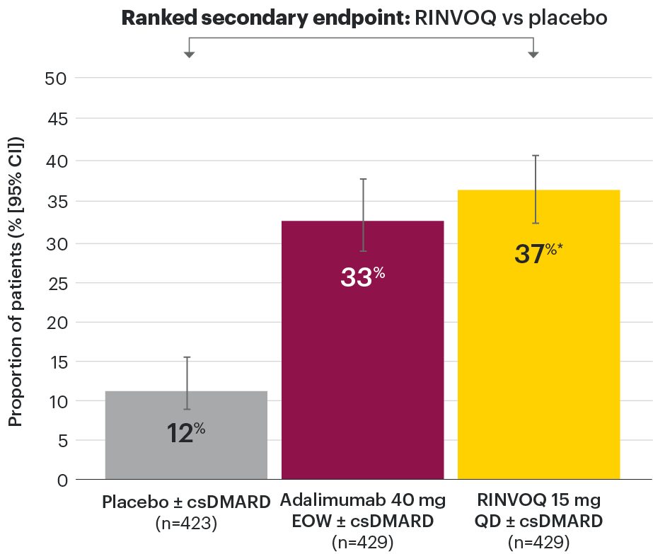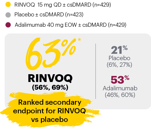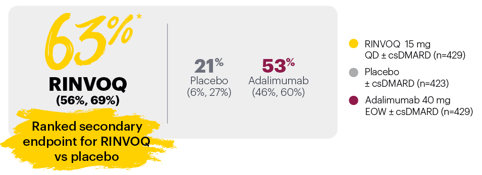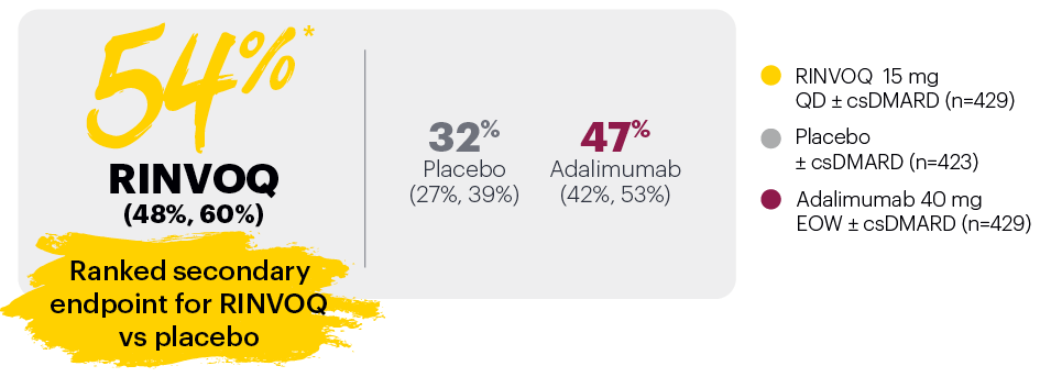*Superiority of RINVOQ 15 mg vs adalimumab could not be demonstrated, which prevented the testing of significance for secondary endpoints lower in the testing hierarchy.