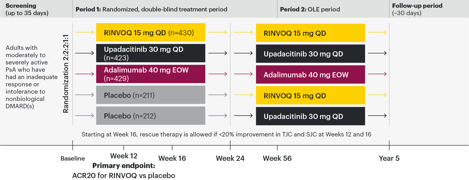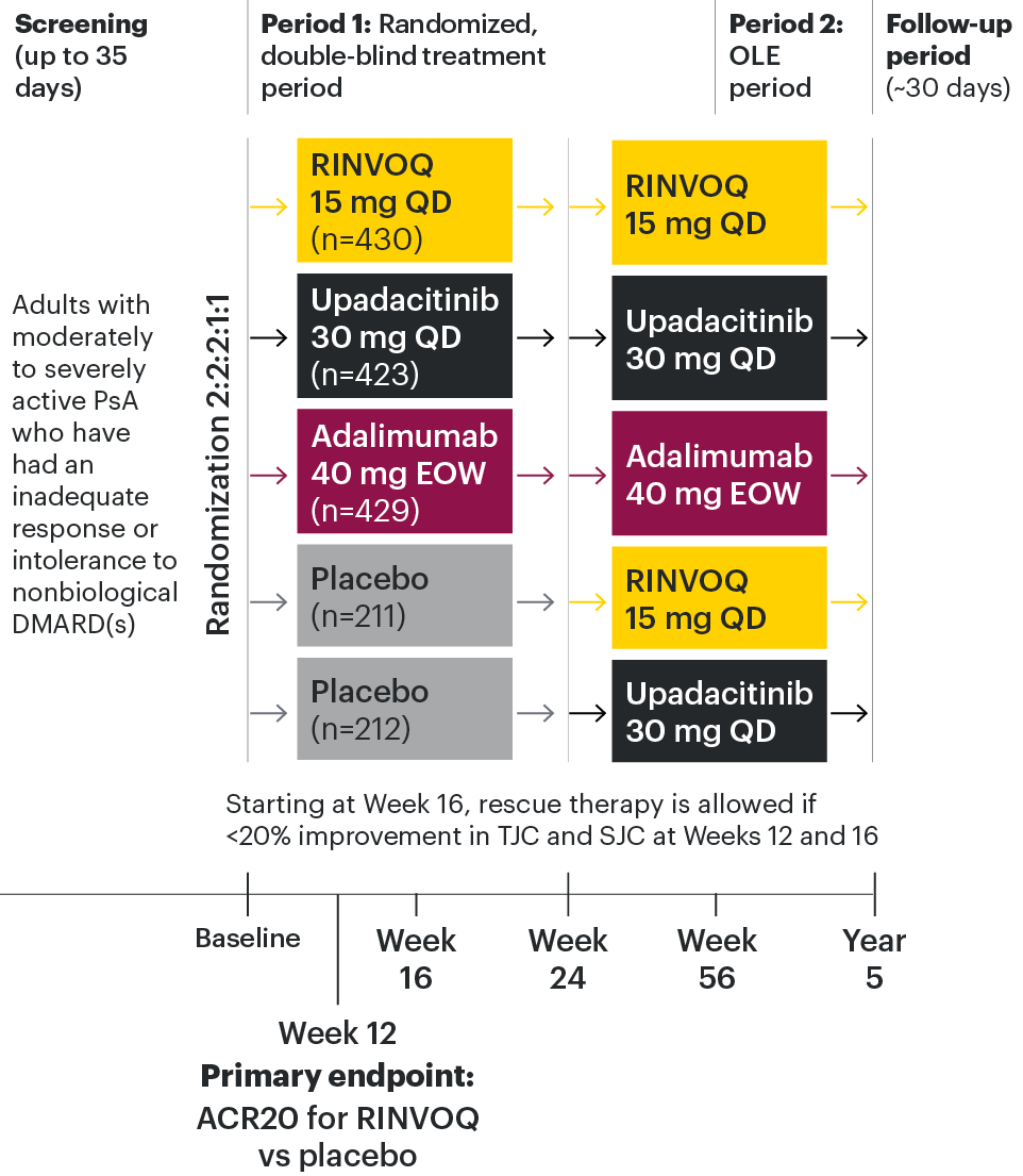 A Phase 3 study investigating the efficacy and safety of RINVOQ compared with placebo and adalimumab for the treatment of active PsA in patients with an inadequate response to nonbiologic DMARDs1,2