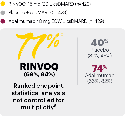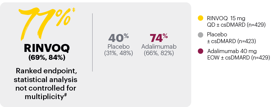 Primary endpoint was the proportion of patients achieving ACR20 response with RINVOQ vs placebo at Week 12. ACR70 for RINVOQ vs placebo at Week 12 was an additional key secondary endpoint, not multiplicity-controlled. Comparison vs adalimumab was not prespecified.