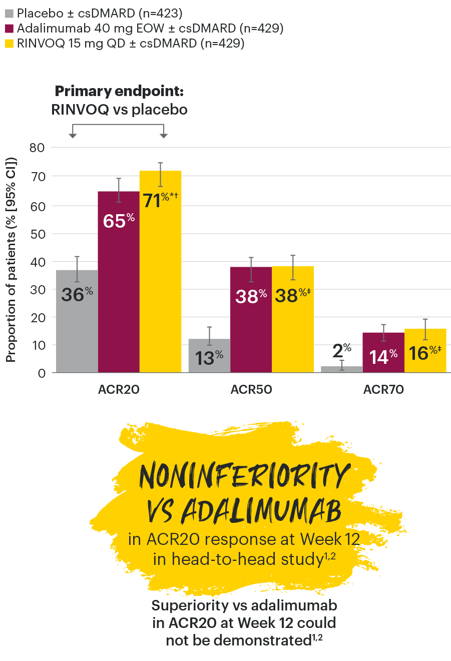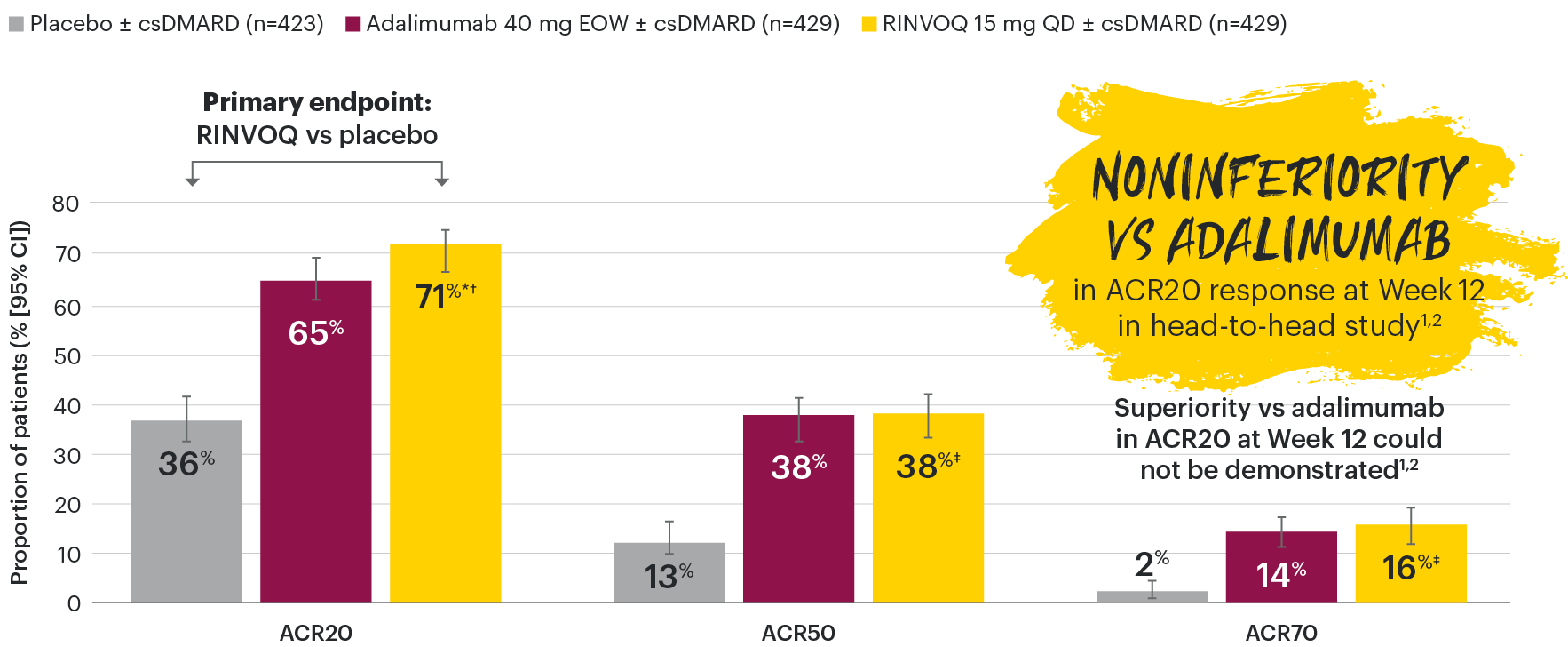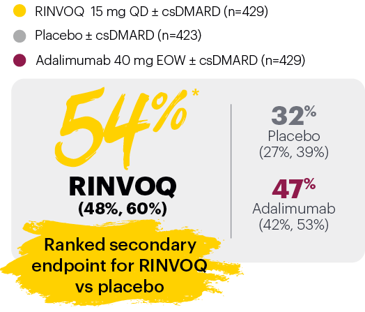 Primary endpoint was the proportion of patients achieving ACR20 response with RINVOQ vs placebo at Week 12. ACR50 for RINVOQ vs placebo at Week 12 was an additional key secondary endpoint, not multiplicity-controlled. Comparison vs adalimumab was not prespecified.
