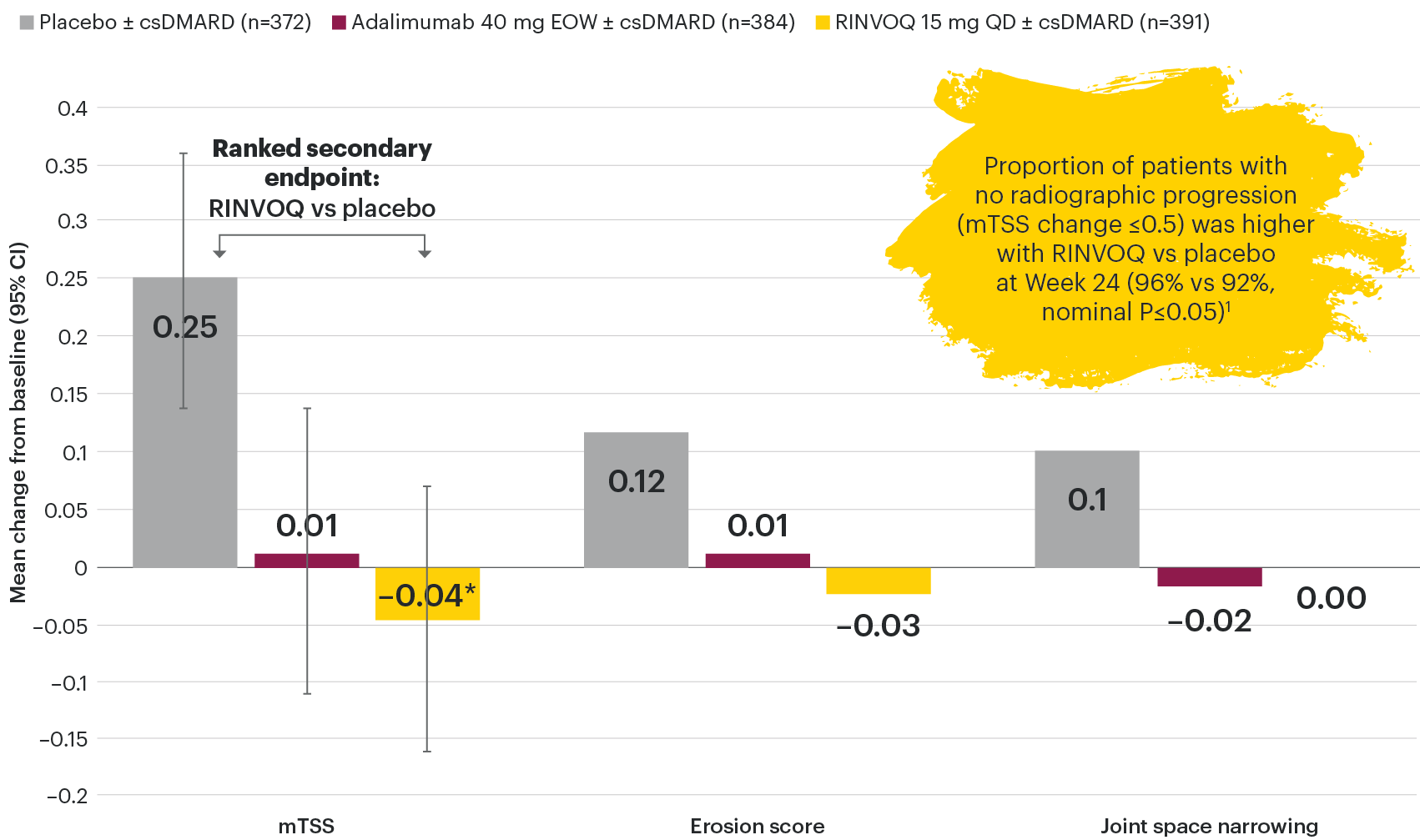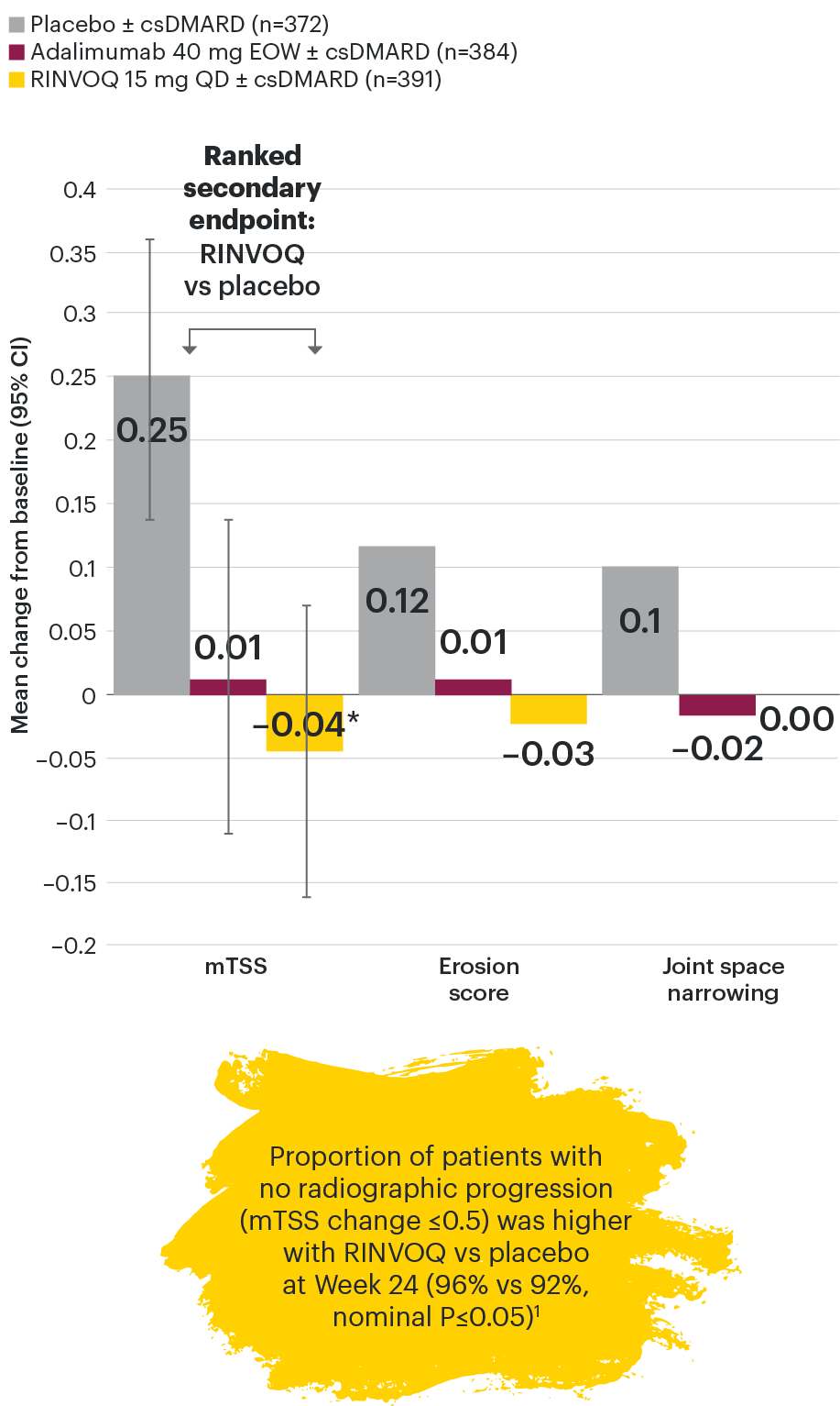 DATA LIMITATIONS: Data not labeled as a primary or ranked secondary endpoint were prespecified, however they were not ranked, not controlled for multiplicity, and have nominal P-values; therefore, treatment differences could represent chance findings. No conclusions regarding these comparisons can be made. No statistical comparisons were made between RINVOQ and adalimumab groups for radiographic endpoints.
