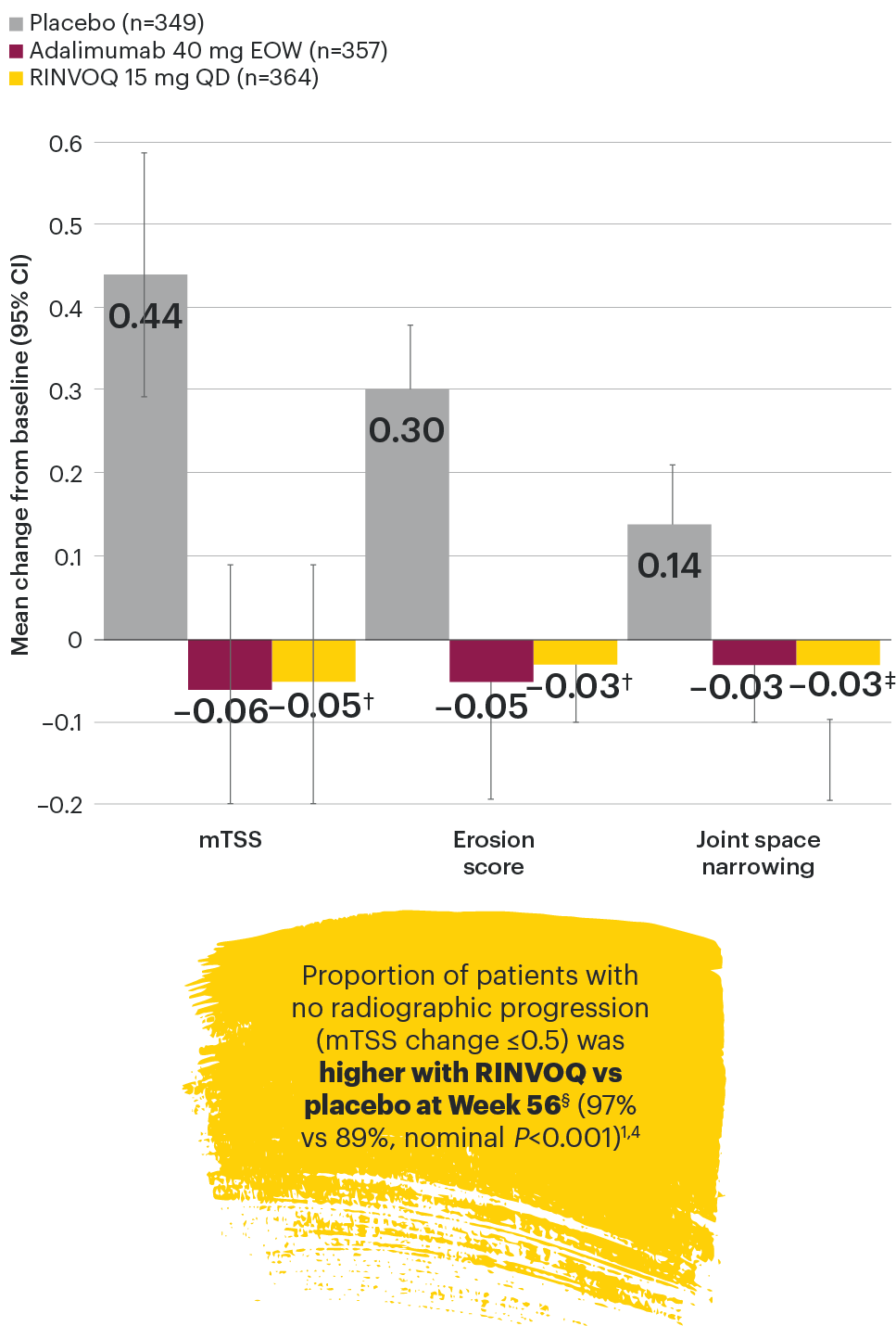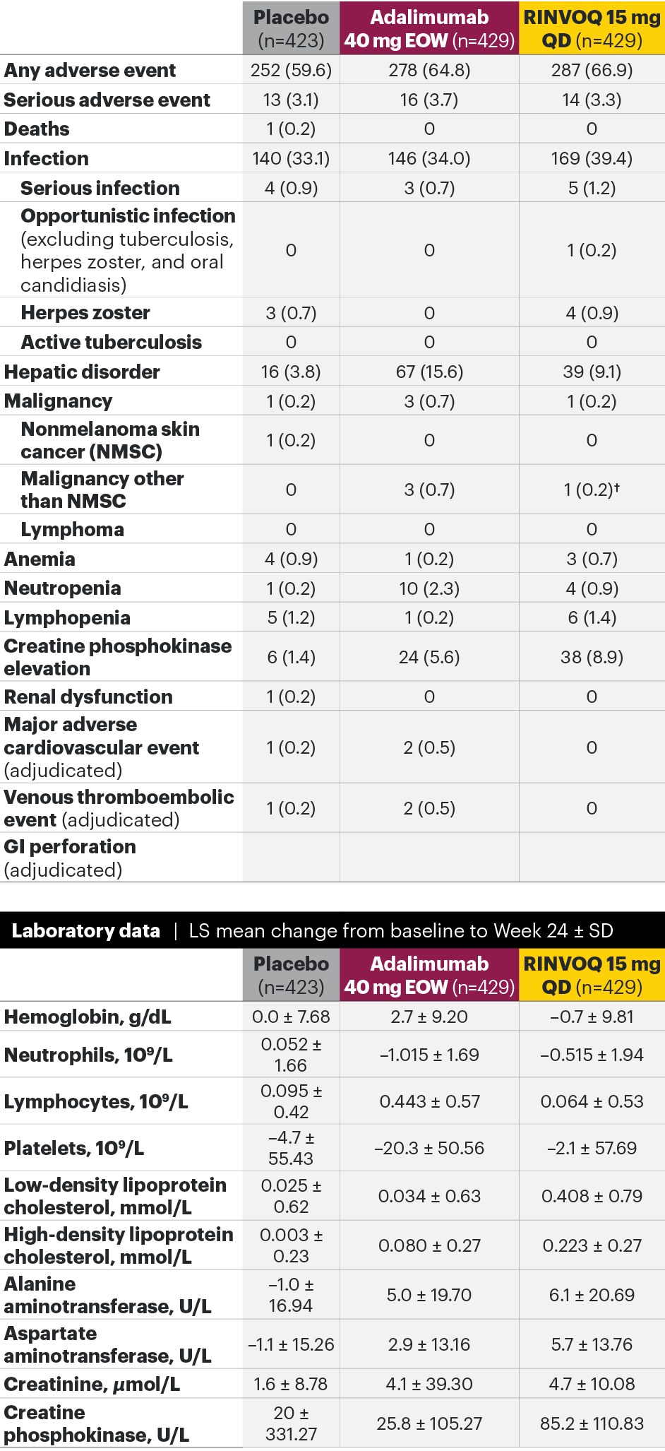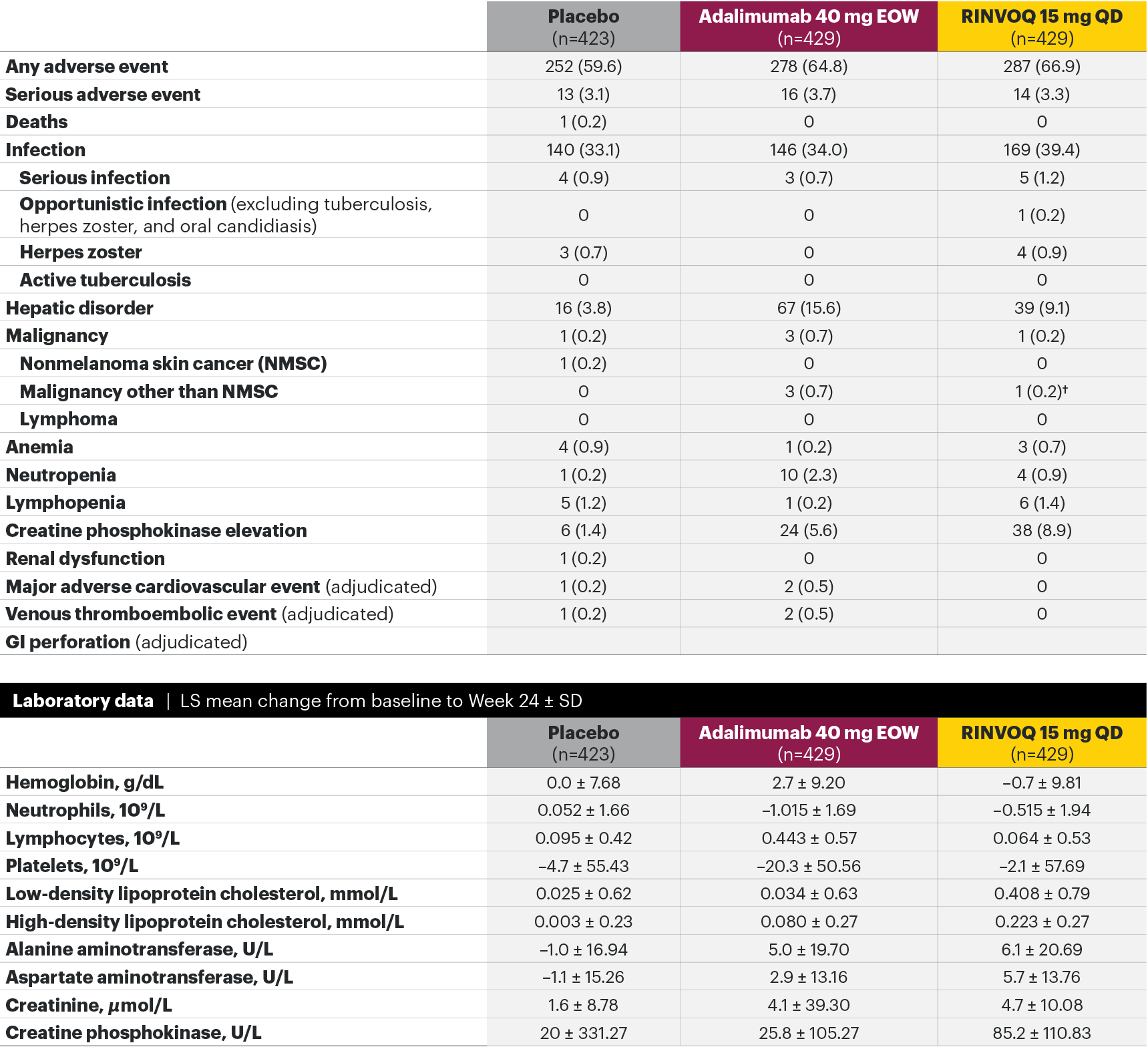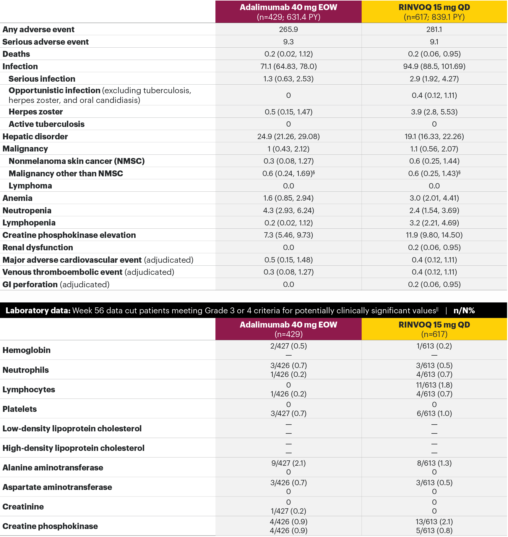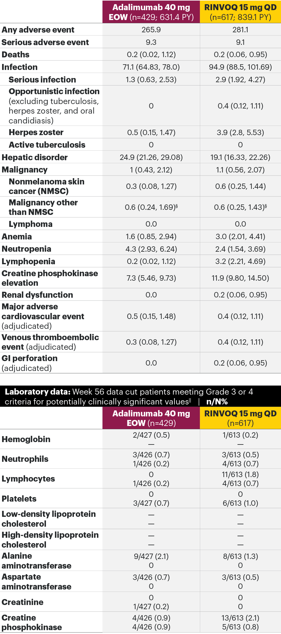 §There were 11 malignancies reported in the RINVOQ 15-mg group (4 basal cell carcinomas, 2 squamous cell carcinoma of skin, and 1 event each of endometrial adenocarcinoma, lung adenocarcinoma, lung cancer metastatic, malignant melanoma, and neuroendocrine carcinoma) and 6 malignancies reported with adalimumab (2 basal cell carcinomas, and 1 event each of colon cancer metastatic, ovarian cancer, pancreatic carcinoma metastatic, and uterine cancer).