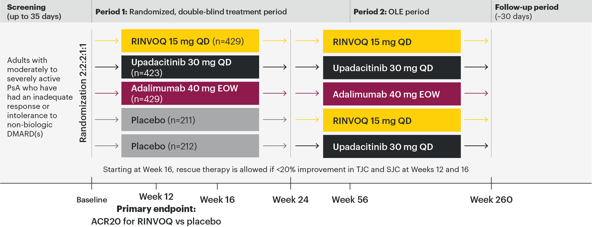A Phase 3 study and open-label extension investigating the efficacy and safety of RINVOQ compared with placebo and adalimumab for the treatment of active PsA in patients with an inadequate response to non-biologic DMARDs1,2