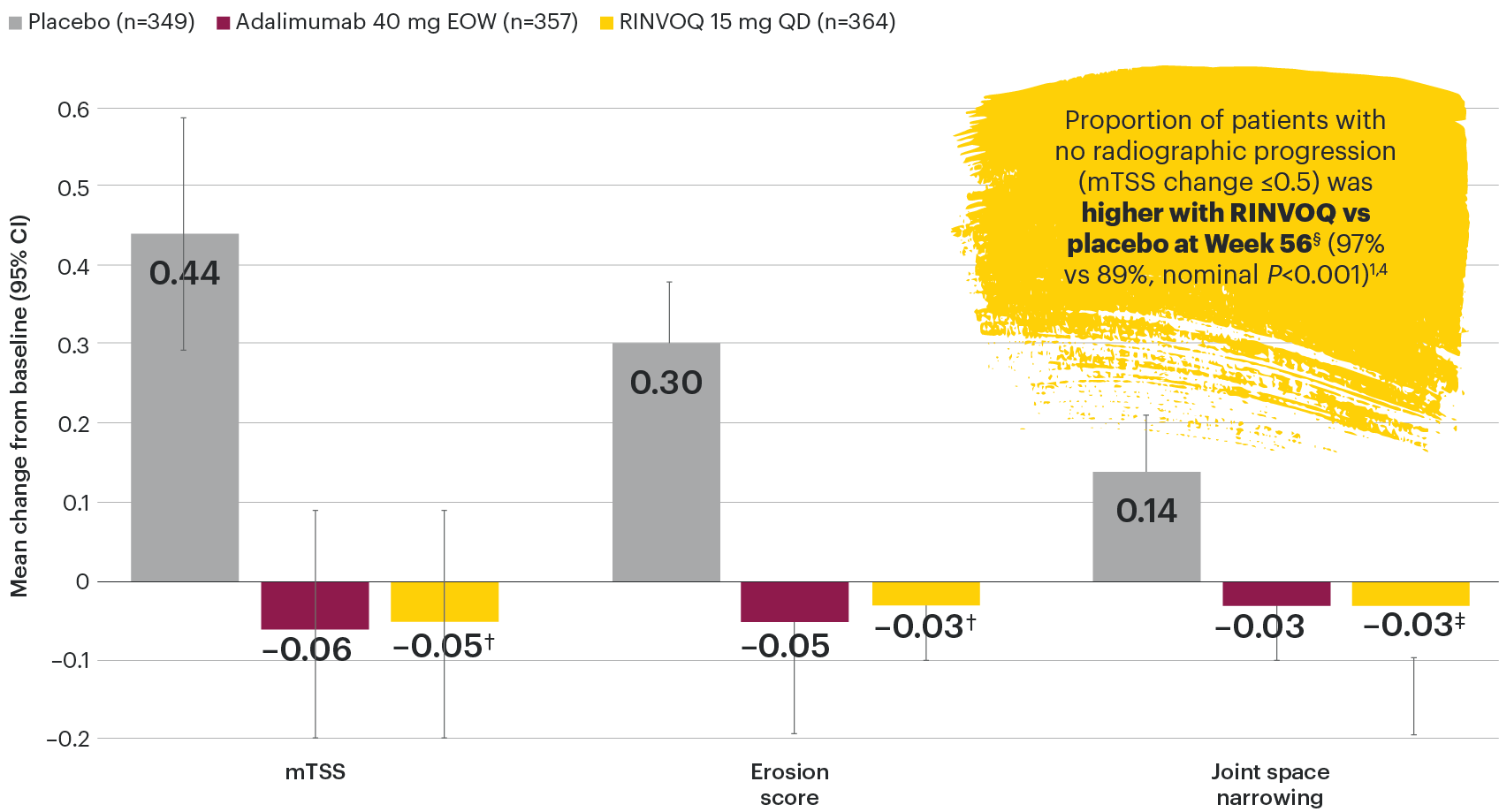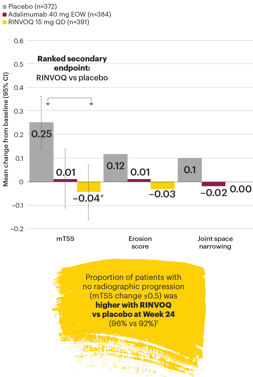 DATA LIMITATIONS: Data not labeled as a primary or ranked secondary endpoint were prespecified, however they were not ranked or controlled for multiplicity; therefore, treatment differences could represent chance findings. No conclusions regarding these comparisons can be made. No statistical comparisons were made between RINVOQ and adalimumab groups for radiographic endpoints.