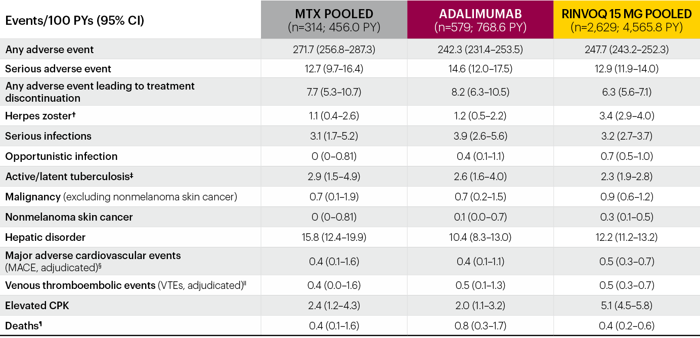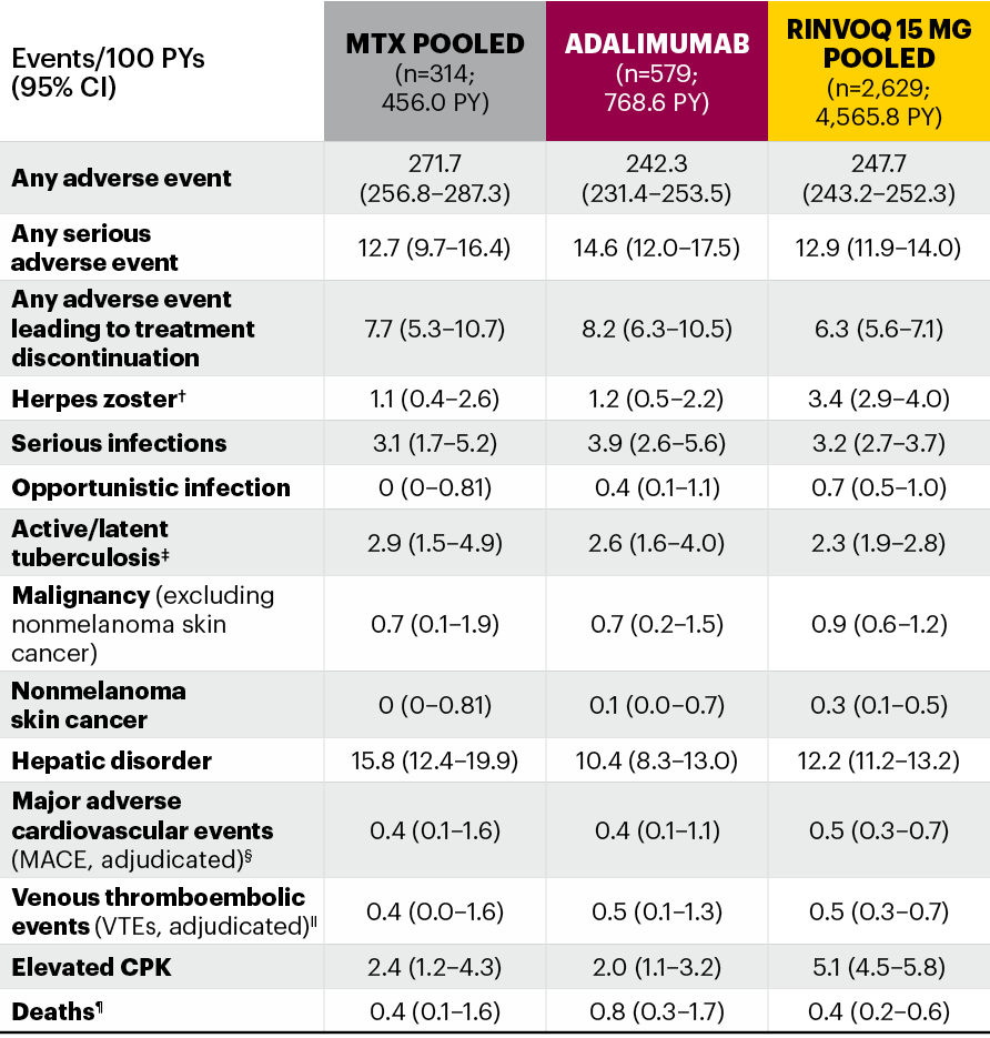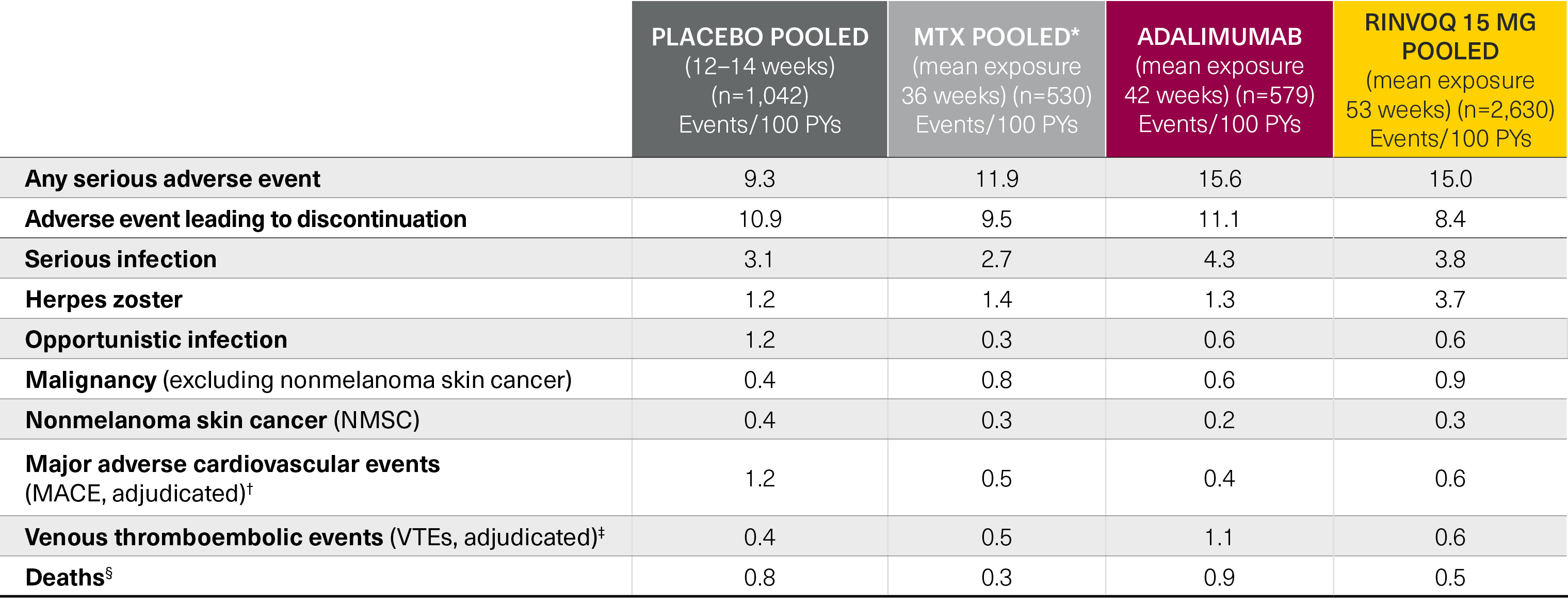 RINVOQ was evaluated from a comprehensive clinical program of 5 pivotal Phase 3 randomized-controlled trials across a spectrum of RA patient populations (SELECT-COMPARE, SELECT-MONOTHERAPY, SELECT-EARLY, SELECT-NEXT, and SELECT-BEYOND). All 5 trials evaluated RINVOQ 15 mg QD and all but SELECT-COMPARE evaluated UPA 30 mg QD. MTX-naive patients receiving MTX monotherapy in SELECT-EARLY and MTX-IR patients receiving adalimumab + MTX in SELECT-COMPARE were included. Two studies evaluated UPA as monotherapy (SELECT-EARLY and SELECT-MONOTHERAPY) while the remaining 3 studies (SELECT-NEXT, SELECT-BEYOND, and SELECT-COMPARE) evaluated UPA in combination with csDMARDs. Patients who switched from placebo, adalimumab, or MTX to UPA were included in the UPA analysis set from the start of UPA treatment, while those who switched from UPA to adalimumab (SELECT-COMPARE) were included in the adalimumab data set from the start of adalimumab treatment. In SELECT-COMPARE, switching from adalimumab to UPA (or vice versa) could occur at Week 14, 18, 22, or 26 based on prespecified criteria. MTX monotherapy was censored at time of rescue to combination therapy (addition of UPA). TEAEs and AESIs were summarized for each treatment group in terms of exposure-adjusted event rates, calculated as the total number of events adjusted for total exposure to UPA and expressed as E/100 PYs. TEAEs were defined as events with an onset date on or after the first dose of study drug and no more than 30 days (70 days for adalimumab) after last dose of study drug in cases of premature discontinuation. Median exposures were 101.9 weeks (maximum 179.7 weeks) in the RINVOQ 15 mg group, 92.6 weeks (maximum 169.0 weeks) in the MTX monotherapy group, and 78.6 weeks (maximum 179.0 weeks) in the adalimumab + MTX group.