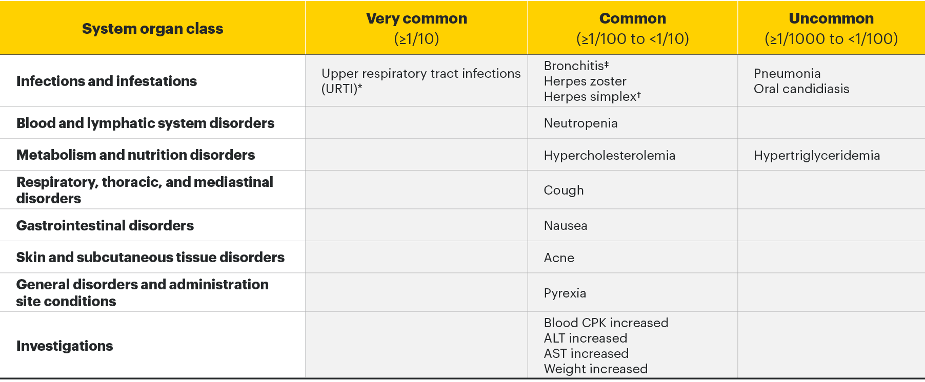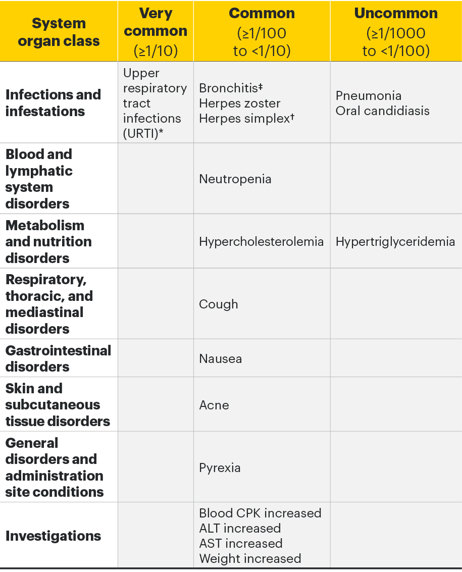 The most commonly reported adverse drug reactions (ADRs) were upper respiratory tract infections, bronchitis, nausea, blood creatine phosphokinase (CPK) increased, and cough. The most common serious adverse reactions were serious infections.3