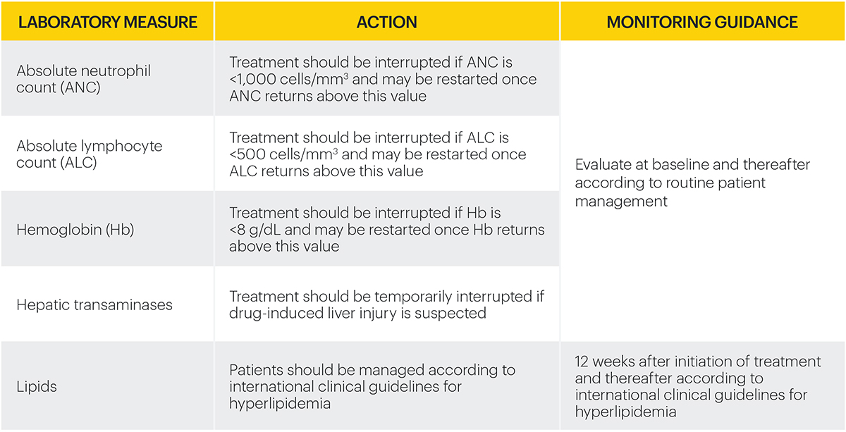 Absolute neutrophil count <1000 cells/mm3, absolute lymphocyte count <500 cells/mm3, or hemoglobin levels <8 g/dL were reported in ≤1% of patients in clinical trials. Treatment should not be initiated, or should be temporarily interrupted, in patients with these hematological abnormalities observed during routine patient management.