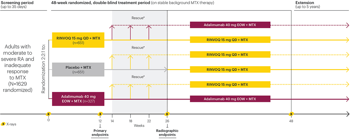 *Rescue criteria: At Weeks 14, 18, and 22, patients receiving adalimumab or placebo were switched to RINVOQ and patients receiving RINVOQ were switched to adalimumab if <20% improvement in tender joint count and swollen joint count vs baseline. At Week 26, all remaining placebo patients who were not rescued were switched to RINVOQ, and patients receiving RINVOQ or adalimumab were switched to adalimumab and RINVOQ, respectively, if CDAI >10.
