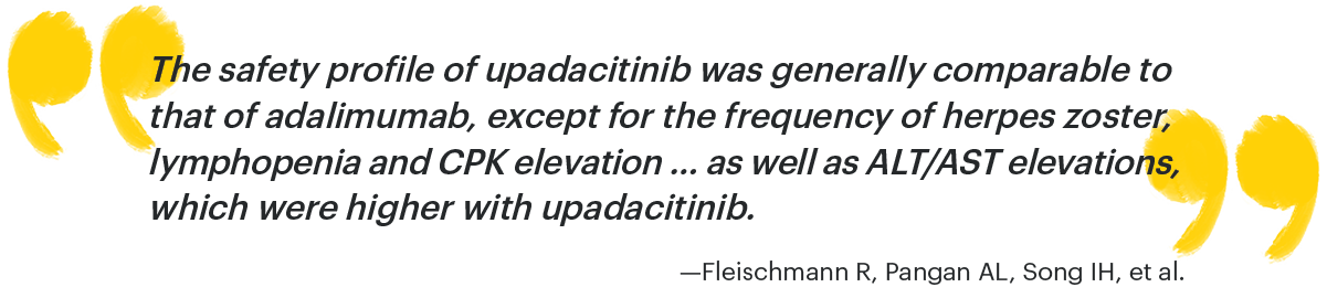 - Fleischmann RM, Genovese MC, Enejosa JV, et al. Safety and effectiveness of upadacitinib or adalimumab plus methotrexate in patients with rheumatoid arthritis over 48 weeks with switch to alternate therapy in patients with insufficient response. Ann Rheum Dis. 2019;78(11):1454-1462. doi:10.1136/annrheumdis-2019-215764