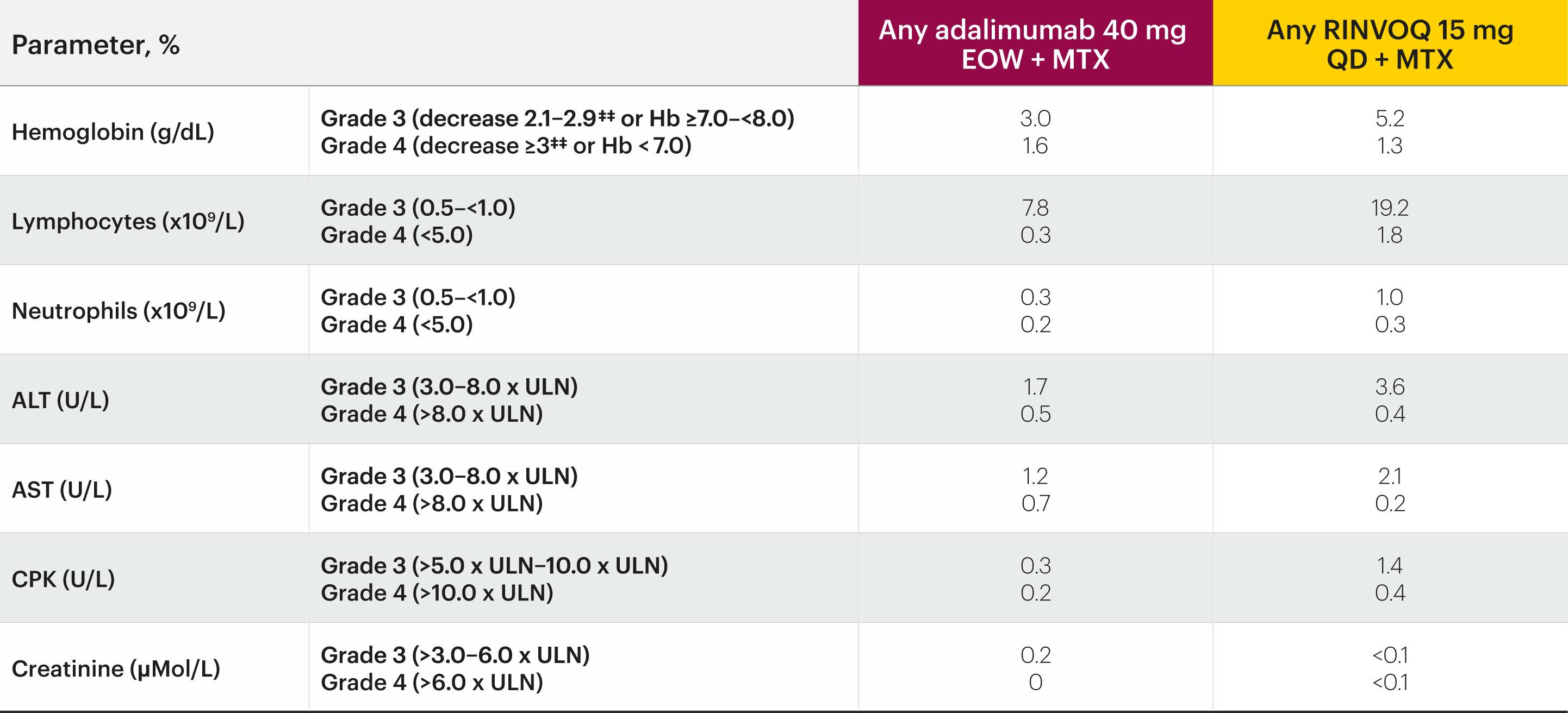 ††Data is for patients with worsening in grade severity for laboratory parameters. Grading is based on OMERACT criteria, except for CPK and creatinine, where National Cancer Institute Common Toxicity Criteria are used.