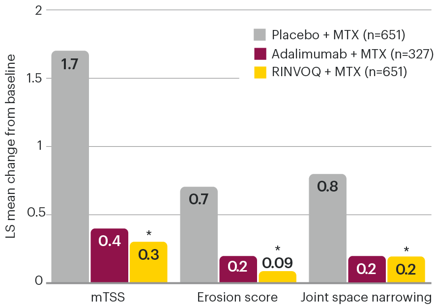 Change in mTSS for RINVOQ + MTX vs placebo + MTX at Week 26 was a ranked secondary endpoint controlled for multiplicity. All other data shown for RINVOQ + MTX vs placebo + MTX were prespecified nonranked endpoints not controlled for multiplicity; nominal P-values are provided. No statistical comparisons were made between RINVOQ and adalimumab groups for radiographic endpoints.