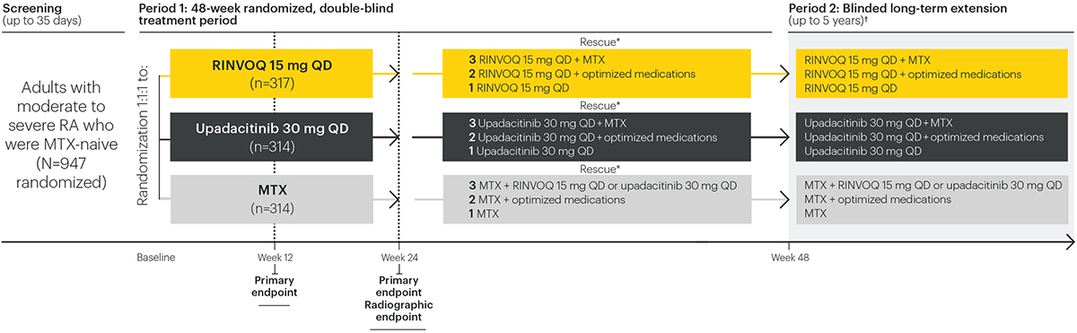 †Study drug assignments remain the same in the blinded extension while allowing initiation of, or change in, background RA medication(s) as per local label.