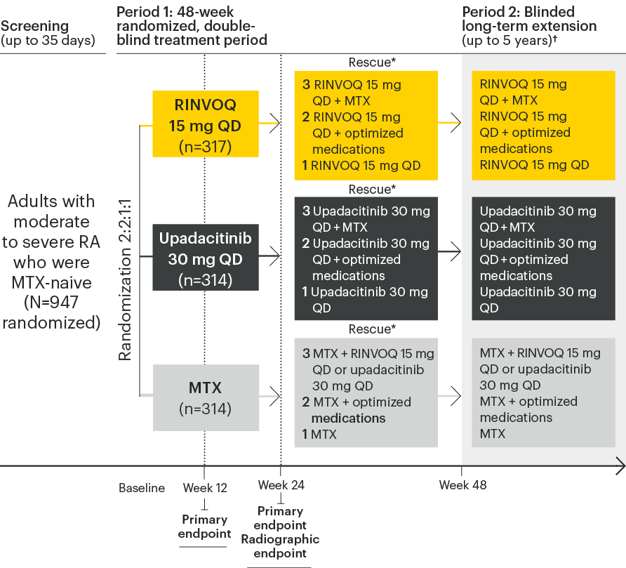 A Phase 3 study investigating the efficacy and safety of RINVOQ monotherapy compared with MTX in MTX-naive patients with moderately to severely active RA1,2