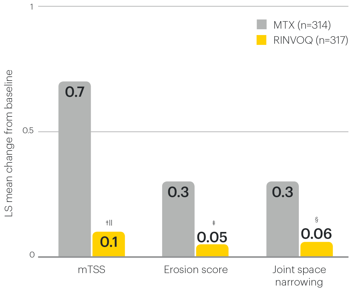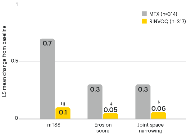Change in mTSS for RINVOQ vs MTX at Week 24 was a ranked secondary endpoint controlled for multiplicity. All other data shown for RINVOQ vs MTX were prespecified nonranked endpoints not controlled for multiplicity; nominal P-values are provided.