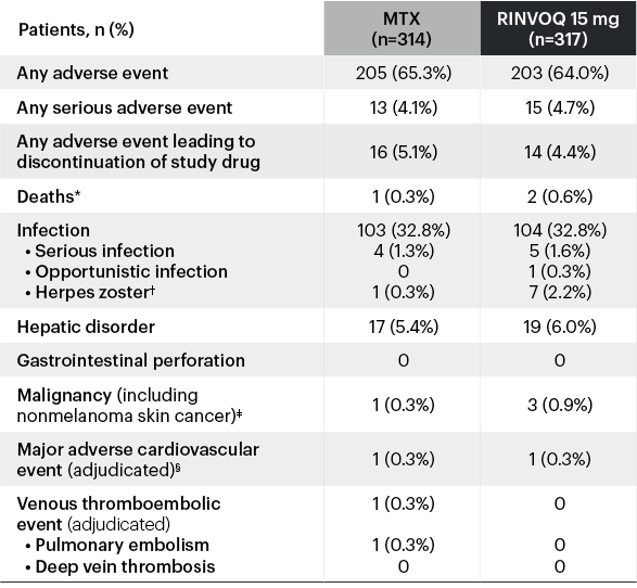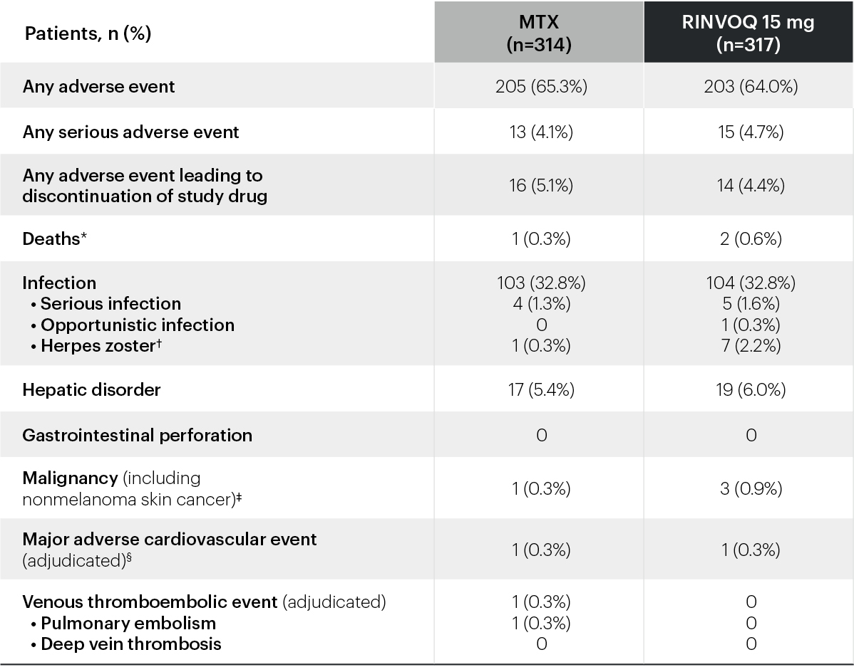 *Deaths: In the methotrexate group, there was 1 sudden CV death. In the RINVOQ 15 mg group, there was 1 CV death, 1 death due to metastatic malignant melanoma.