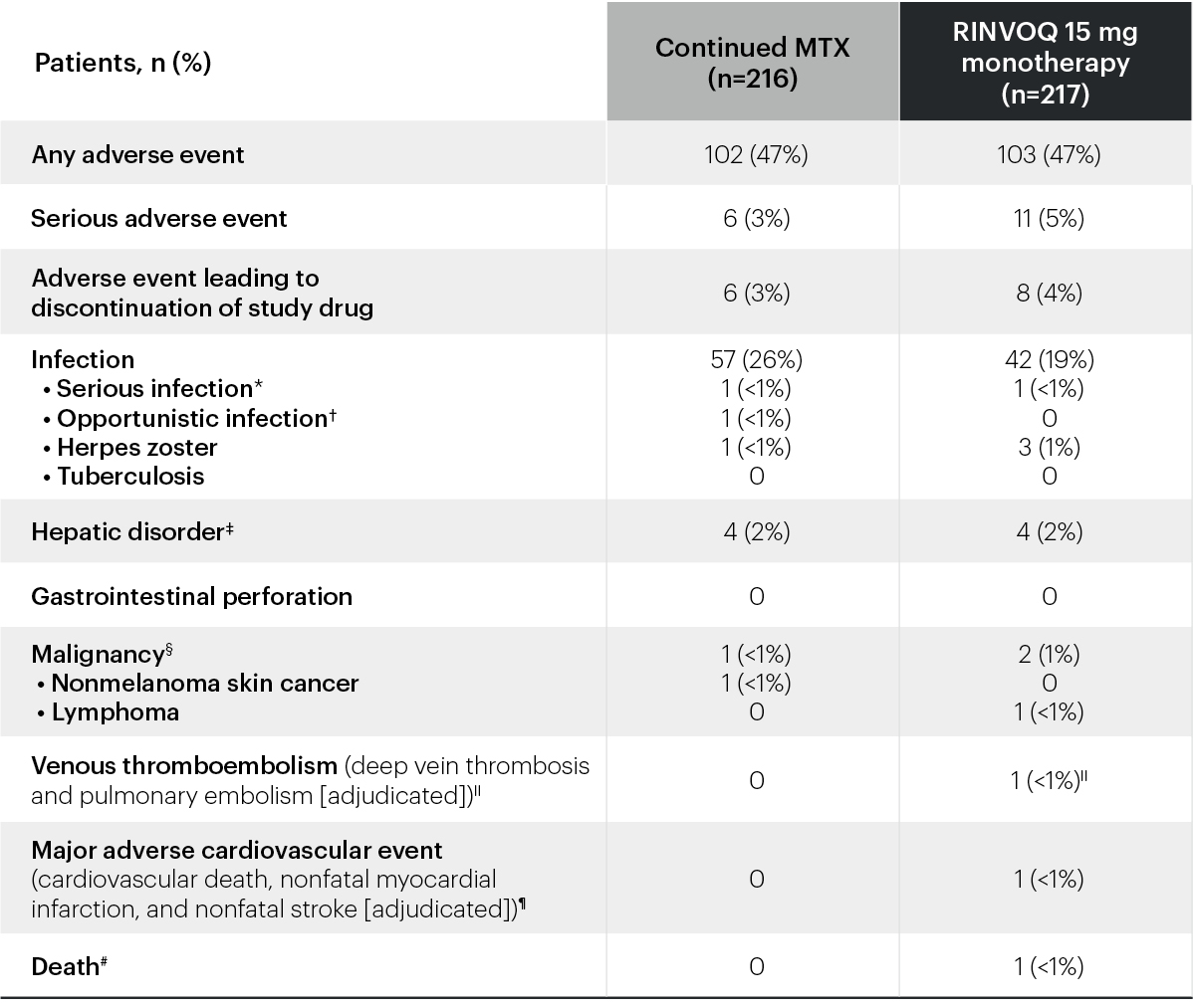 *Serious infection: In the methotrexate group, there was 1 case of urosepsis. In the RINVOQ 15-mg group, there was 1 limb abscess.