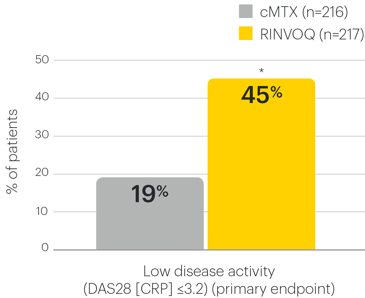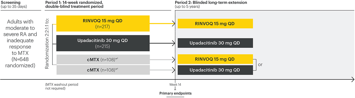 *For the primary analysis at Week 14, comparisons of RINVOQ 15 mg and upadacitinib 30 mg vs cMTX were done by combining data from the two cMTX groups.