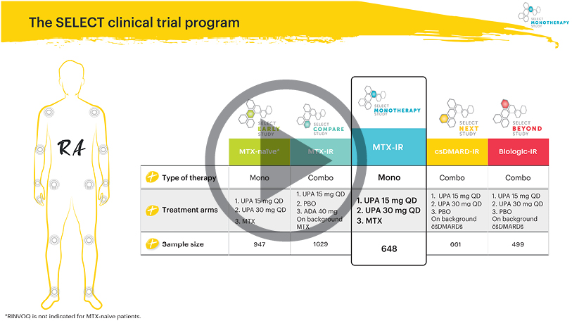 RINVOQ is an oral selective and reversible JAK inhibitor indicated for the treatment of moderate to severe active rheumatoid arthritis in adult patients who have responded inadequately to, or who are intolerant to one or more disease-modifying anti-rheumatic drugs (DMARDs). RINVOQ may be used as monothrrapy or in combination with methotrexate.