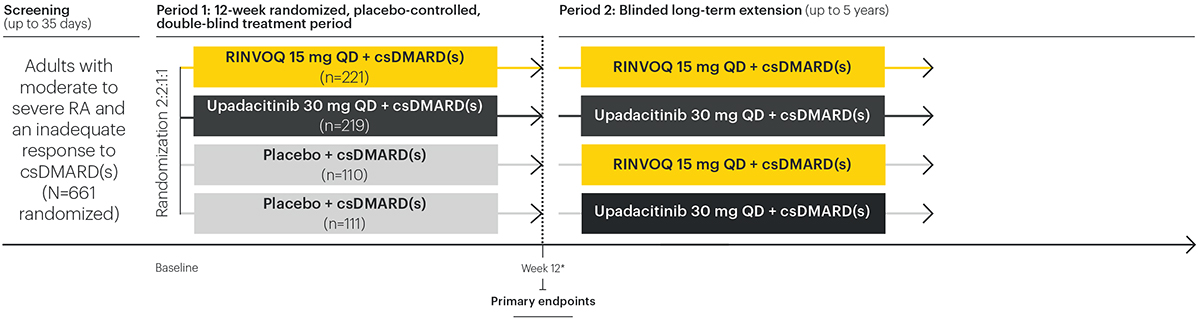 A Phase 3 study investigating the efficacy and safety of RINVOQ + csDMARDs compared to placebo + csDMARDs in patients with moderate to severe RA and an inadequate response to csDMARDs1