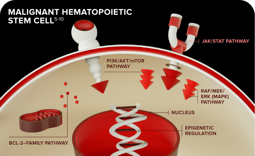 References: 1. Pettit K, Odenike O. Novel therapies for myelofibrosis. Curr Hematol Malig Rep. 2017;12(6):611-624. doi:10.1007/s11899-017-0403-0 2. Schieber M, Crispino JD, Stein B. Myelofibrosis in 2019: moving beyond JAK2 inhibition. Blood Cancer J. 2019;9(9):74. doi:10.1038/s41408-019-0236-2 3. Santos FPS, Verstovsek S. Therapy with JAK2 inhibitors for myeloproliferative neoplasms. Hematol Oncol Clin North Am. 2012;26(5):1083-1099. doi:10.1016/j.hoc.2012.07.008 4. Gleitz HFE, Pritchard JE, Kramann R, Schneider RK. Fibrosis driving myofibroblast precursors in MPN and new therapeutic pathways. HemaSphere. 2019;3(S2):142-145. doi:10.1097/HS9.0000000000000216 5. Ishida S, Akiyama H, Umezawa Y, et al. Mechanisms for mTORC1 activation and synergistic induction of apoptosis by ruxolitinib and BH3 mimetics or autophagy inhibitors in JAK2-V617F-expressing leukemic cells including newly established PVTL-2. Oncotarget. 2018;9(42):26834-26851. doi:10.18632/oncotarget.25515 6. Gozgit JM, Bebernitz G, Patil P, et al. Effects of the JAK2 inhibitor, AZ960, on Pim/BAD/BCL-xL survival signaling in the human JAK2 V617F cell line SET-2. J Biol Chem. 2008;283(47):32334-32343. doi:10.1074/jbc.M803813200 7. Tremblay D, Mascarenhas J. Next generation therapeutics for the treatment of myelofibrosis. Cells. 2021;10(5):1034. doi:10.3390/cells10051034 8. Feng Y, Chen X, Cassady K, et al. The role of mTOR inhibitors in hematologic disease: from bench to bedside. Front Oncol. 2021;10:611690. doi:10.3389/fonc.2020.611690 9. Meyer SC, Levine RL. Molecular pathways: molecular basis for sensitivity and resistance to JAK kinase inhibitors. Clin Cancer Res. 2014;20(8):2051-2059. doi:10.1158/1078-0432.CCR-13-0279 10. Moens U, Kostenko S, Sveinbjørnsson B. The role of mitigen-activated protein kinase-activated protein kinases (MAPKAPKs) in inflammation. Genes. 2013;4(2):101-133. doi:10.3390/genes4020101 11. Yang Q, Crispino JD, Wen QJ. Kinase signaling and targeted therapy for primary myelofibrosis. Exp Hematol. 2017;48:32-38. doi:10.1016/j.exphem.2016.12.007 12. Agarwal A, Morrone K, Bartenstein M, Zhao ZJ, Verma A, Goel S. Bone marrow fibrosis in primary myelofibrosis: pathogenic mechanisms and the role of TGF-β. Stem Cell Investig. 2016;3(5):1-10. doi:10.3978/j.issn.2306-9759.2016.02.03 13. Petiti J, Lo Iacono M, Rosso V. Bcl-xL represents a therapeutic target in Philadelphia negative myeloproliferative neoplasms. J Cell Mol Med. 2020;24(18):10978-10986. doi:10.1111/jcmm.15730 14. Tognon R, Gasparotto EPL, Neves RP, et al. Deregulation of apoptosis-related genes is associated with PRV1 overexpression and JAK2 V617F allele burden in essential thrombocythemia and myelofibrosis. J Hematol Onc. 2012;5(2):1-11. doi:10.1186/1756-8722-5-2 15. Rubert J, Qian Z, Andraos R, Guthy DA, Radimerski T. Bim and Mcl-1 exert key roles in regulating JAK2V617F cell survival. BMC Cancer. 2011;11:24. doi:10.1186/1471-2407-11-24 16. Mughal TI, Vaddi K, Sarlis NJ, Verstovsek S. Myelofibrosis-associated complications: pathogenesis, clinical manifestations, and effects on outcomes. Int J Gen Med. 2014;7:89-101. doi:10.2147/IJGM.S51800 17. Harrison CN, McLornan DP. Current treatment algorithm for the management of patients with myelofibrosis, JAK inhibitors, and beyond. Hematology Am Soc Hematol Educ Program. 2017;2017(1):489-497. doi:10.1182/asheducation-2017.1.489 18. Kramann R, Schneider RK. The identification of fibrosis-driving myofibroblast precursors reveals new therapeutic avenues in myelofibrosis. Blood. 2018;131(19):2111-2119. doi:10.1182/blood-2018-02-834820
